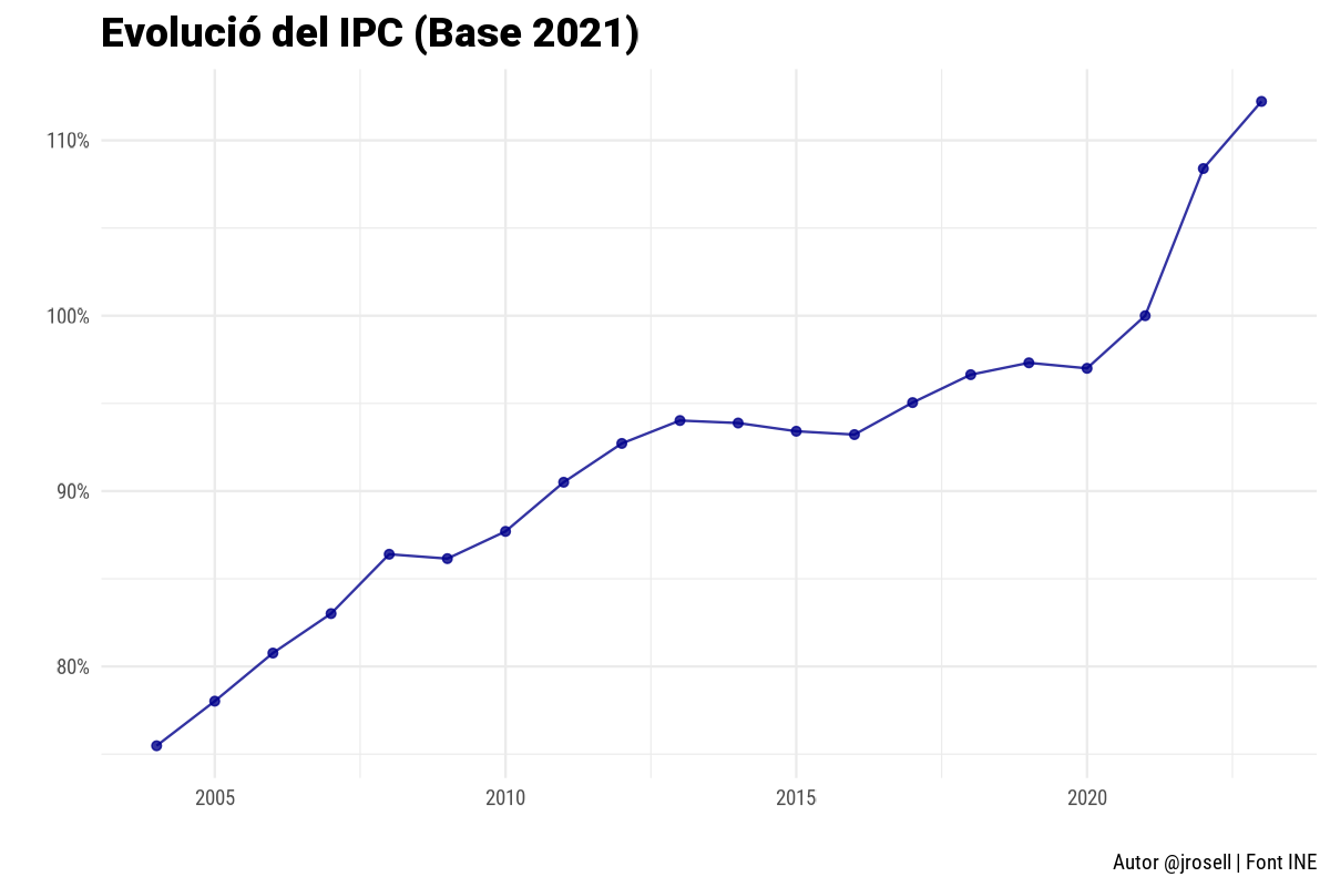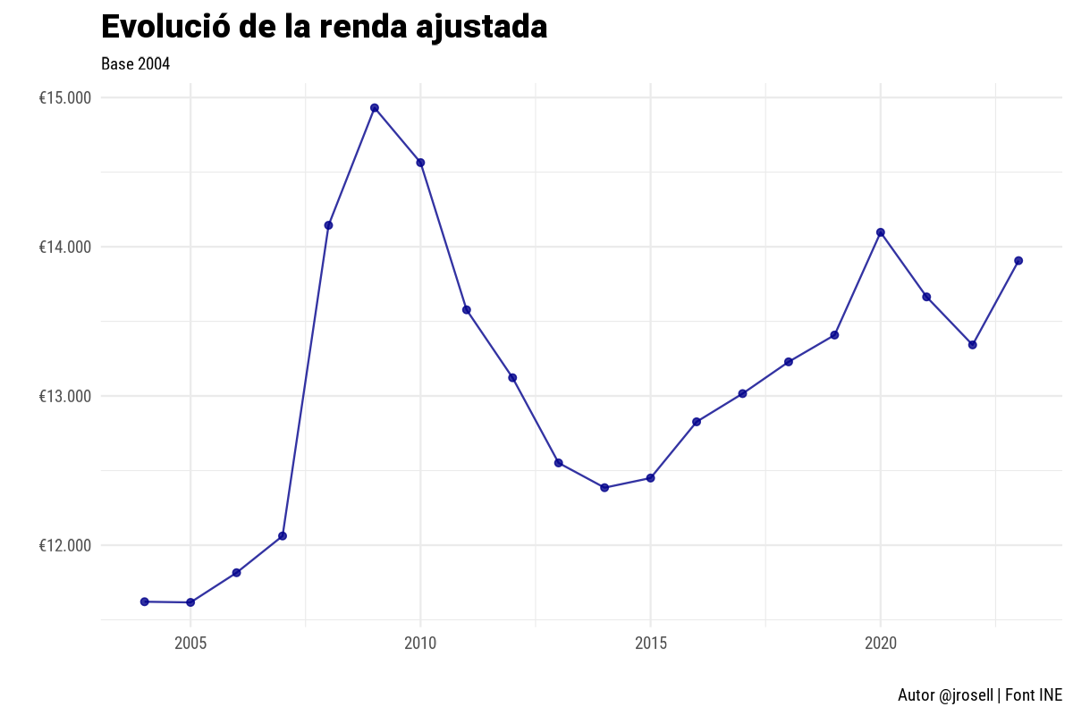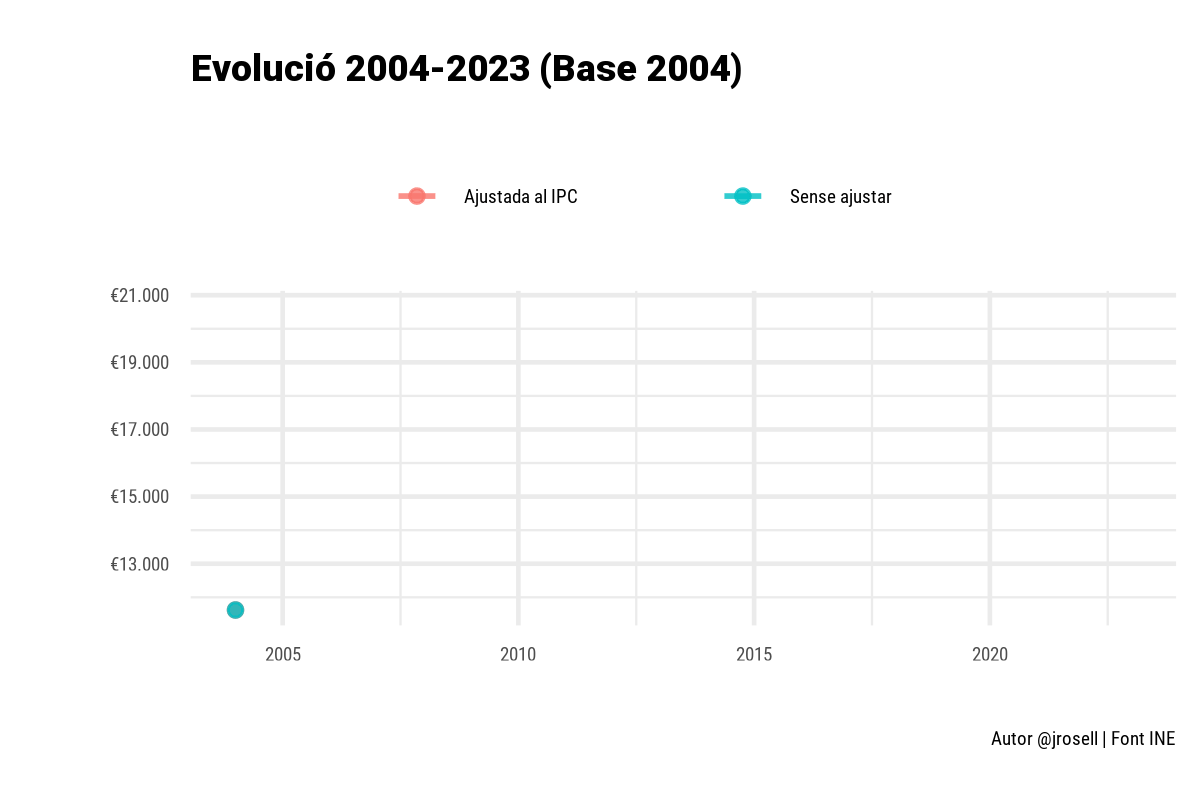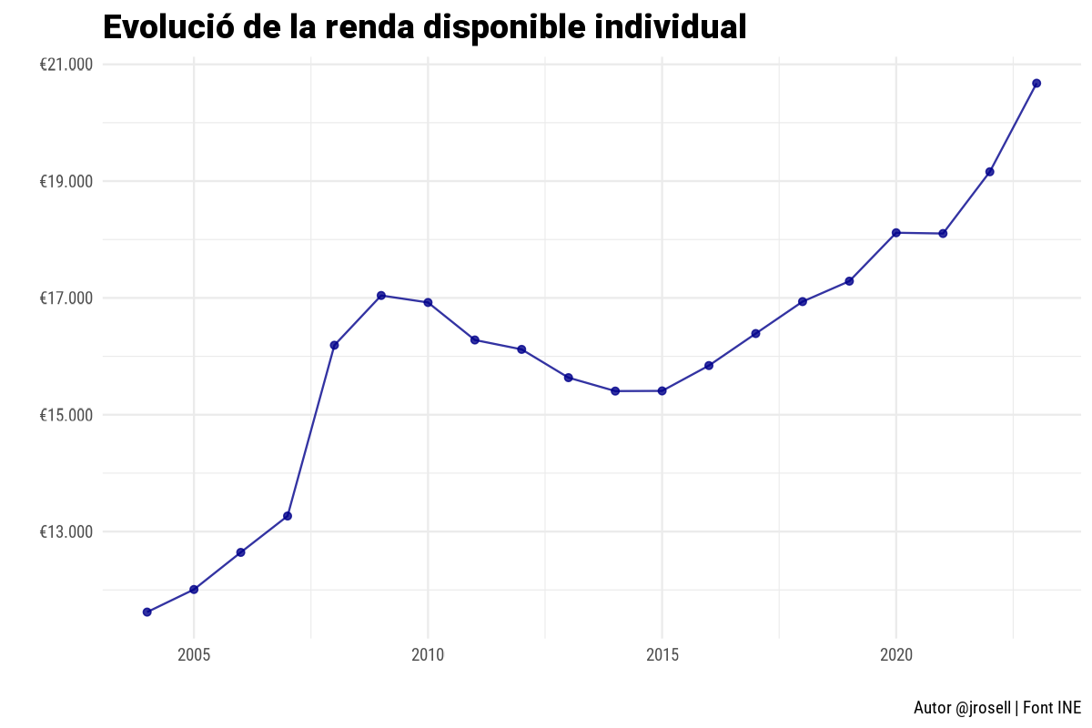 Evolució de la renda disponible individual ajustada al IPC (2004-2023)